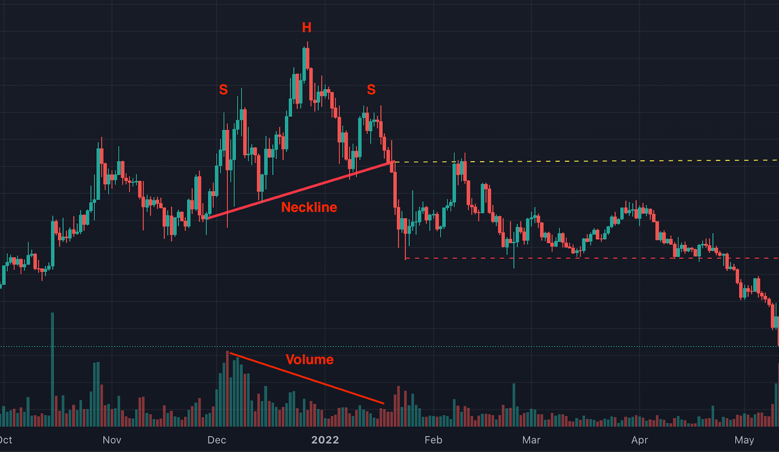 但是,该资产经历了回到颈线水平(黄色虚线)的回归。原因可能是故障期间的交易量相对较低。但由于该资产在回调期间也显示成交量减少,因此价格设法从颈线水**弹并继续下行。