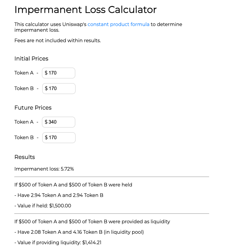 下面是使用下面的无常损失计算器的结果。