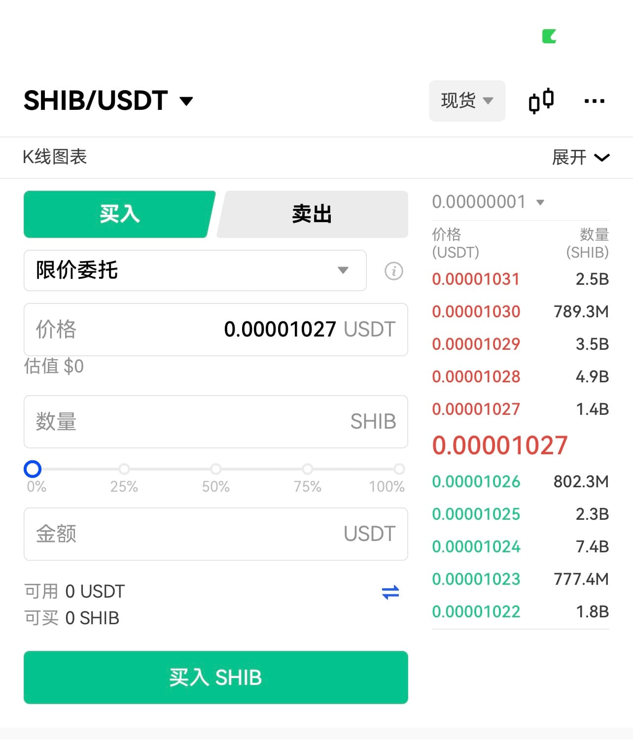 3.向下**至[现货]区域,输入希望买入的SHIB数量。您可以通过不同的订单类型来购买柴犬币。在本示例中,我们选择市价单。点击[买入SHIB],确认订单。您将在现货钱包中看到买入的SHIB。