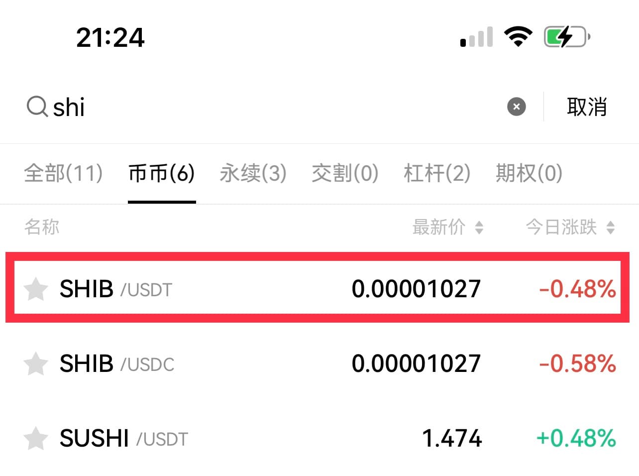 2.在屏幕右侧的搜索栏输入“SHIB”,查看可供选择的交易对。我们以SHIB/USDT为例。点击以打开SHIB/USDT交易页面。