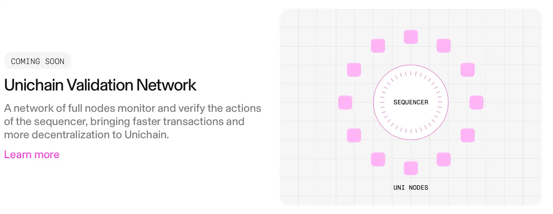 Unichain 验证网络则是一个去**化的 Unichain 节点操作者网络,旨在减少区块排序过程中的某些关键风险,实现更快的经济**性,以便更快地结算跨链交易,并支持潜在的未来扩展。