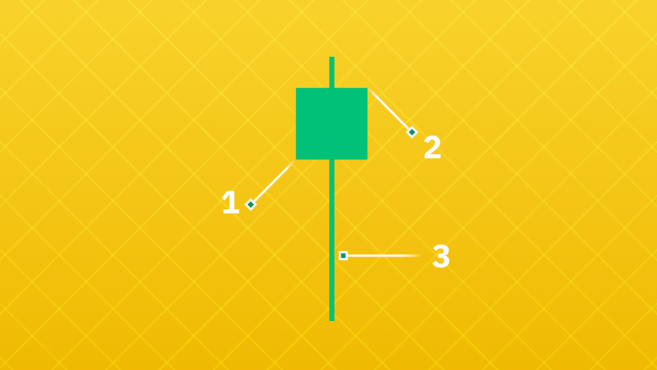 下面您可以看到开盘价 (1)、收盘价 (2) 以及形成烛线或影线的高点和低点 (3)。