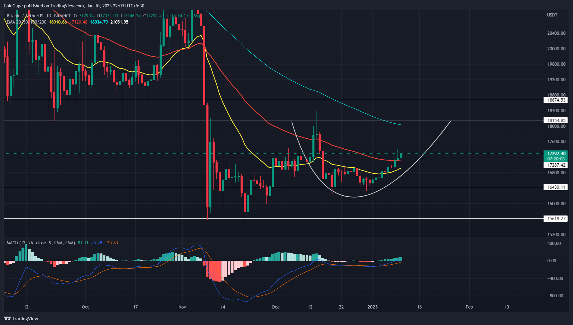 这一看涨突破将进一步支撑圆底形态,并将价格飙升 5%,触及 18150 美元的颈线阻力位。突破这一阻力对 BTC 持有者来说至关重要,因为它会在短期内引发显着增长。