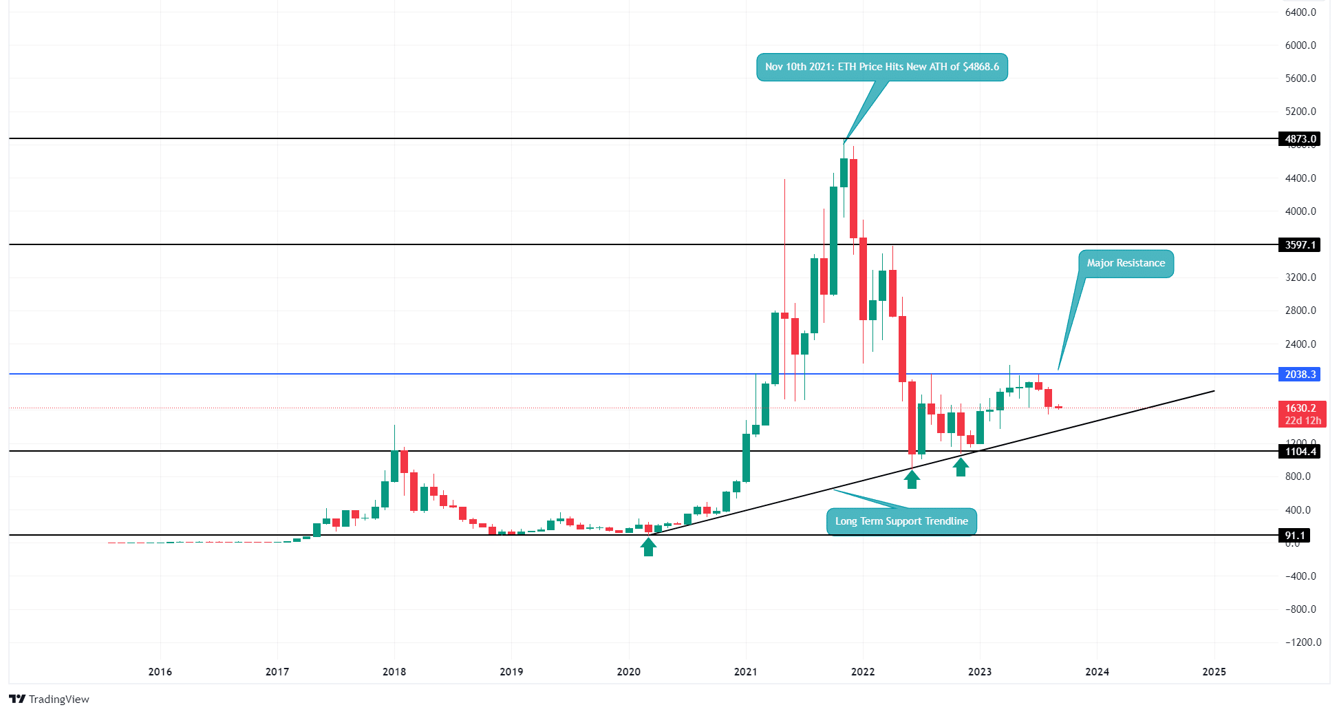 如图所示,以太坊自 2020 年以来一直受到长期支撑。然而,在 2038 美元附近也形成了主要阻力。同一时期,以太坊触及 4868 美元的历史高点。