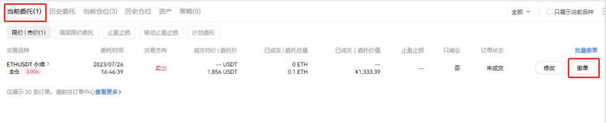 19、选择账户模式、委托类型,输入价格、数量,点击买入开多(看涨)或卖出开空(看空)。未成交的委托挂单可单击撤单撤销委托。此处以开空为例。