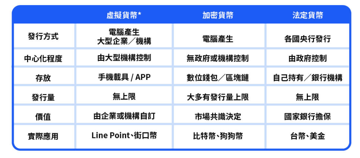 *为了方便比较,表格中的虚拟货币指的是透过大型企业发行的点数货币,例如Line Point、虾币。