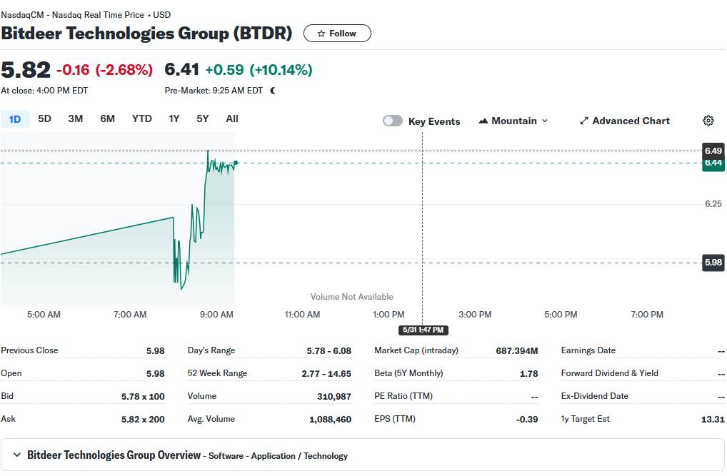 公告发布后,Bitdeer (BTDR) 的股价在盘前交易中上涨了 10% 以上,至 6.41 美元。