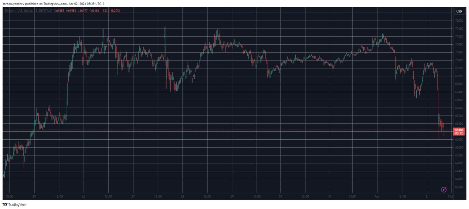 短短几个小时内,加密货币暴跌四倍,跌至 9 天低点 66,000 美元。尽管此后有所收复,但 BTC 当天仍下跌超过 5%,价格约为 66,500 美元。