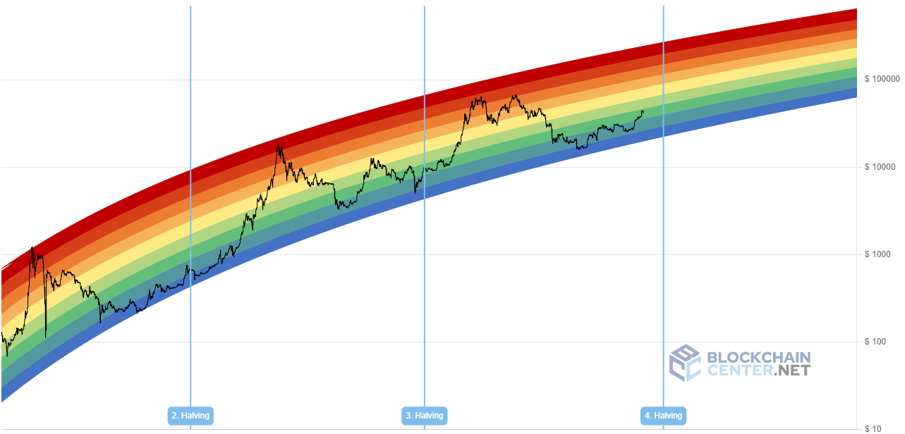 BTC彩虹图是比特币的长期估值工具。它采用对数增长曲线来预测比特币未来潜在的价格变动。该图表包括覆盖对数增长曲线通道的彩虹色带,旨在突出比特币价格经历不同阶段时的市场情绪。因此,它提供了对潜在买卖机会的见解。