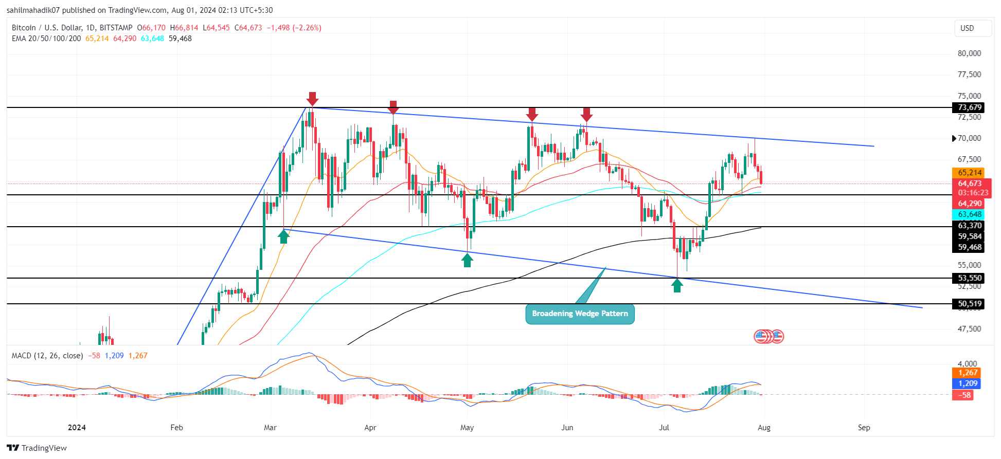 相反,50 天和 100 天的每日指数移动平均线 ( EMA ) 目前接近 63,370 美元,可能会提供支撑并防止进一步下跌。如果这种潜在的逆转失败,它可能为突破楔形模式铺平道路,使BTC突破其之前的高点 73,680 美元。