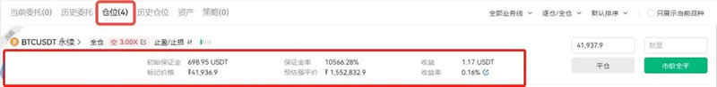 14、挂单成交后,可在持仓界面中可查看订单的相关数据,例如保证金、收益、收益率、预估强平价等。