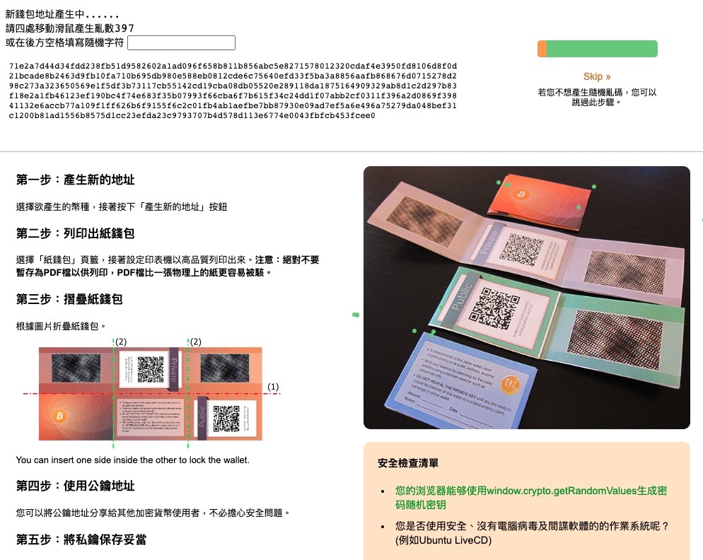 Wallet Generator 是市场上**的纸质加密货币冷钱包。 该网站允许**人在几秒钟内创建一个钱包,并允许用户通过光标移动和随机键盘输入为按键添加额外的随机性。 这提供了额外的安全层。