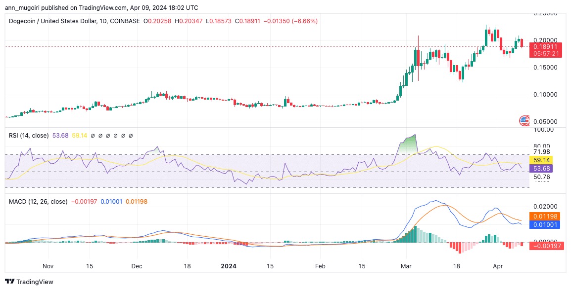 如果看跌压力加剧,狗狗币可能会跌破 0.18 美元,并可能达到 0.15 美元的支撑位,表明市场趋势转向看跌。相反,看涨复苏可能会将价格推回 0.2 美元,并有可能迈向 1 美元的**。实现这样的里程碑取决于狗狗币克服重大阻力位并保持势头。相对强弱指数 (RSI) 为 53.68,表明市场处于平衡状态,既不由买家也不由卖家主导。与此同时,移动平均线趋同背离(MACD)预示着可能转向看涨势头,MACD 线近期升至信号线上方就证明了这一点。