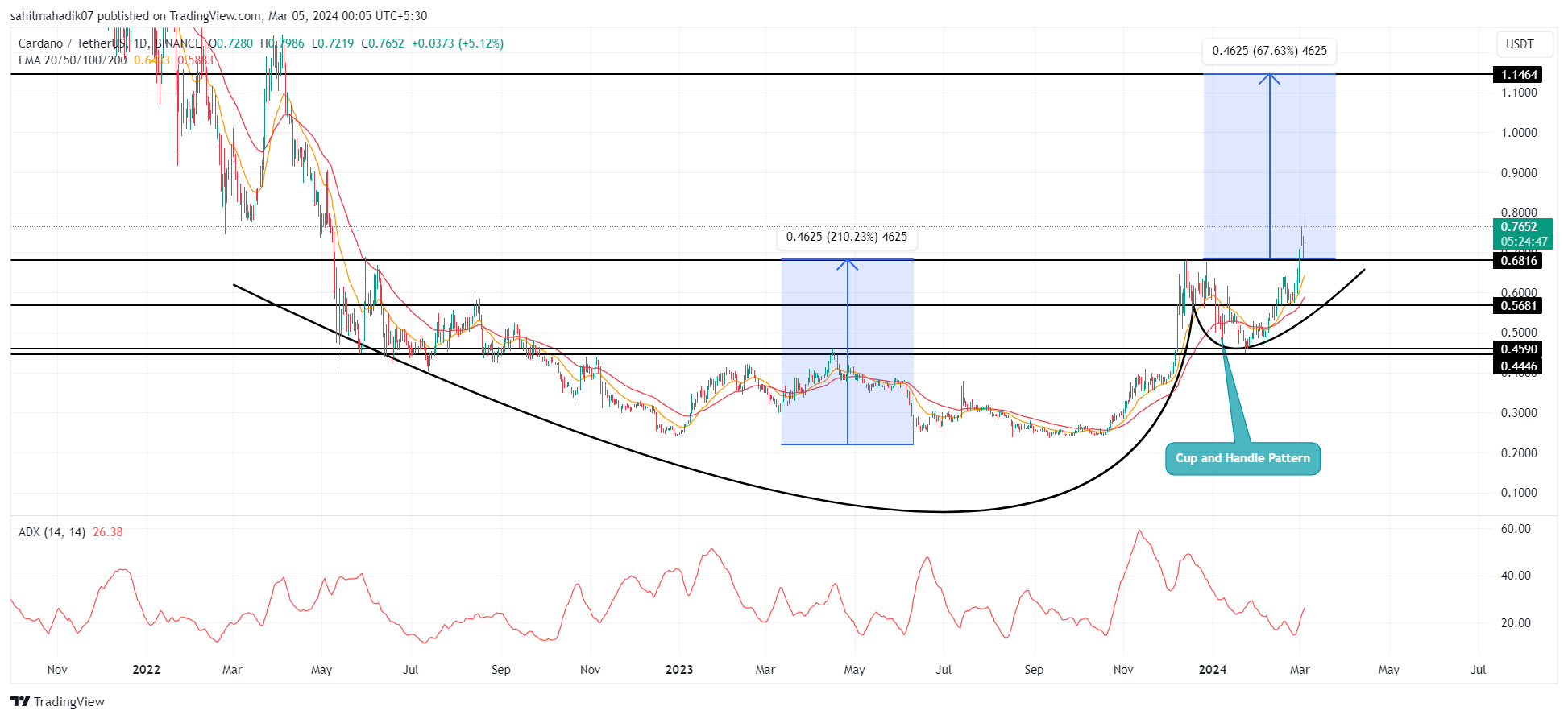 卡尔达诺(ADA)加密货币自 1 月底以来表现出显着复苏,其价格从 0.444 美元的低点反弹,标志着投资者的重大转变,在短短 41 天内上涨了 75%,将价格推升至目前的水平0.783 美元。这种令人印象深刻的上涨不仅是由更广泛的市场看涨情绪推动的,也是由坚实的技术形态和市场对卡尔达诺情绪的增强所推动的。