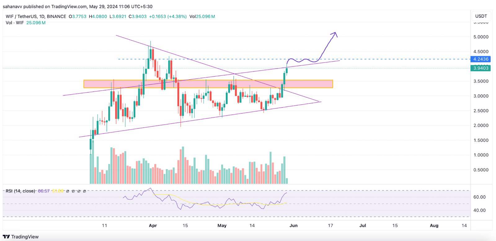 最近的飙升帮助该股反弹测试了关键阻力位,并在过去几天中突破了区间。然而,RSI 在接近上限时显示出一些看跌背离,表明在确认突破区间之前可能会出现小幅回调。只要 $WIF 价格保持在 3.55 美元以上,看涨势头就不会**耗尽。