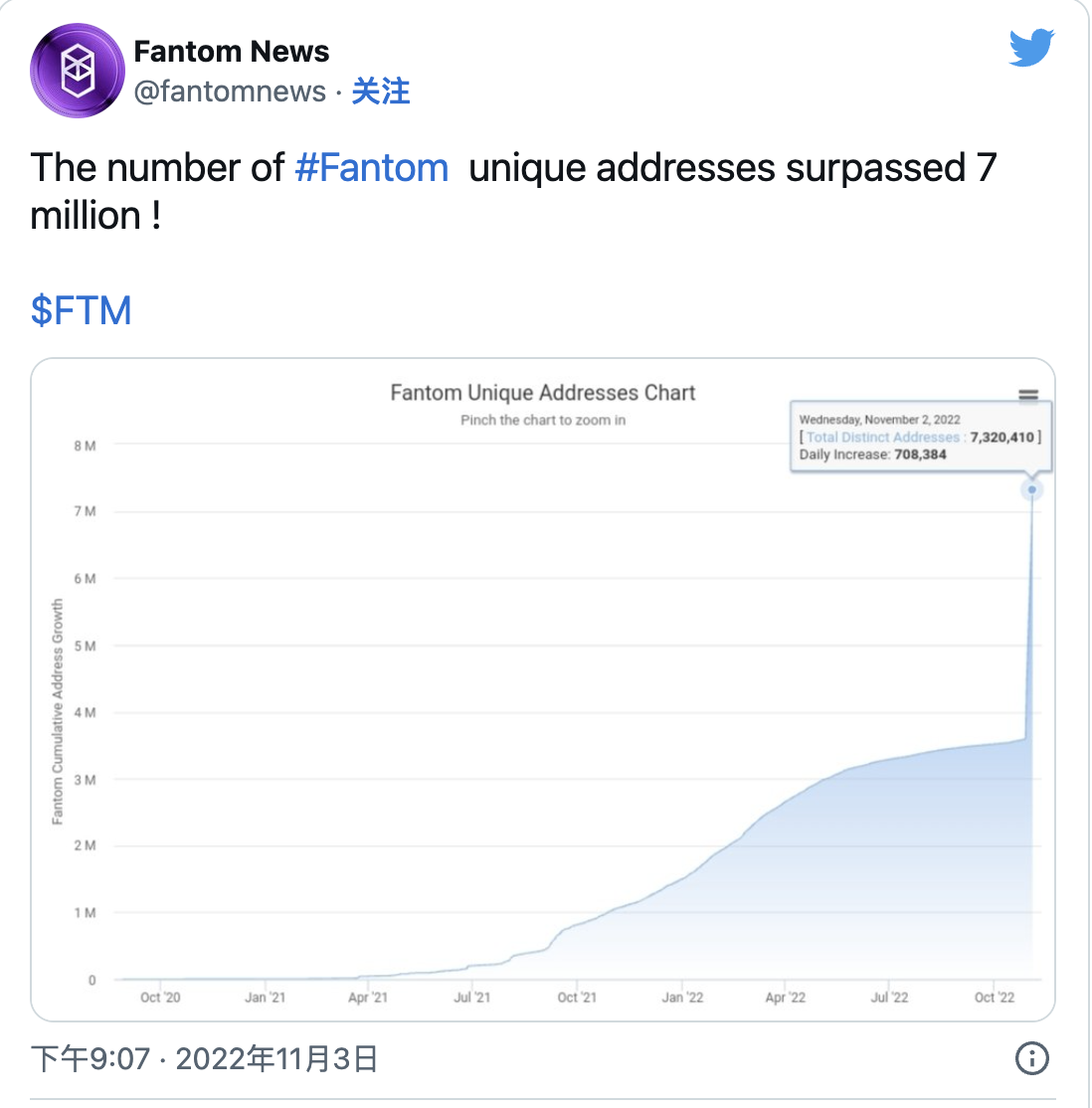 FTM或将暴涨,它在7天内超过700万个唯一地址