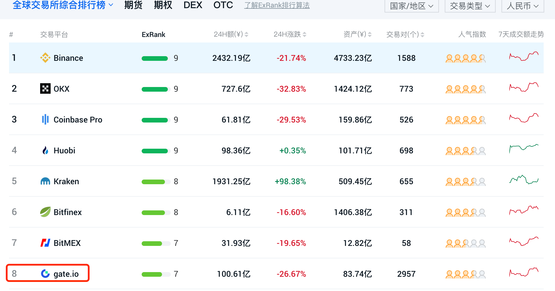 gate.io(芝麻交易所)在全球交易所中的排名第几?