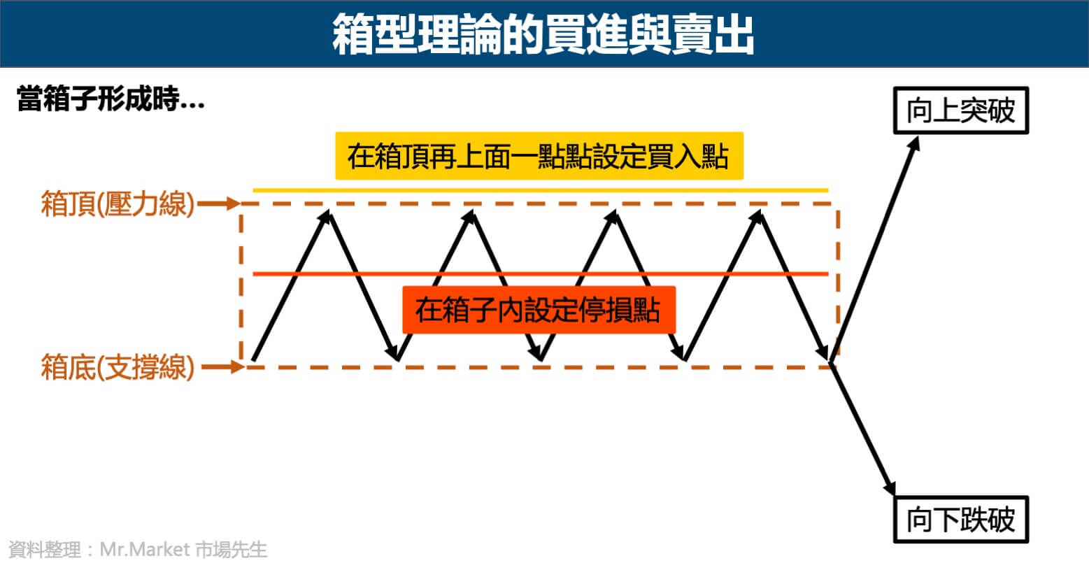通常会发生满明确的趋势,也就是突破趋势线后,上涨/下跌的力道都很强,而且越长的箱体,趋势就会越强。