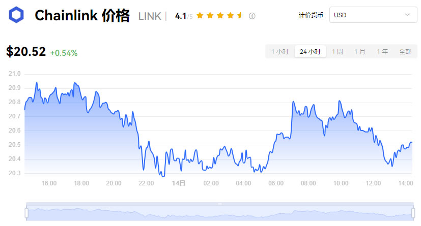 LINK币当前价格为 $20.52。LINK币的价格从 00:00 (UTC 8) 上涨了 0.54%。目前,LINK币市值排名为第 15 名,实时市值为 $120.49亿,流通供应量为 5.88亿 LINK,**供应量为 10.00亿 LINK。我们会实时更新 Chainlink/USD 的价格。