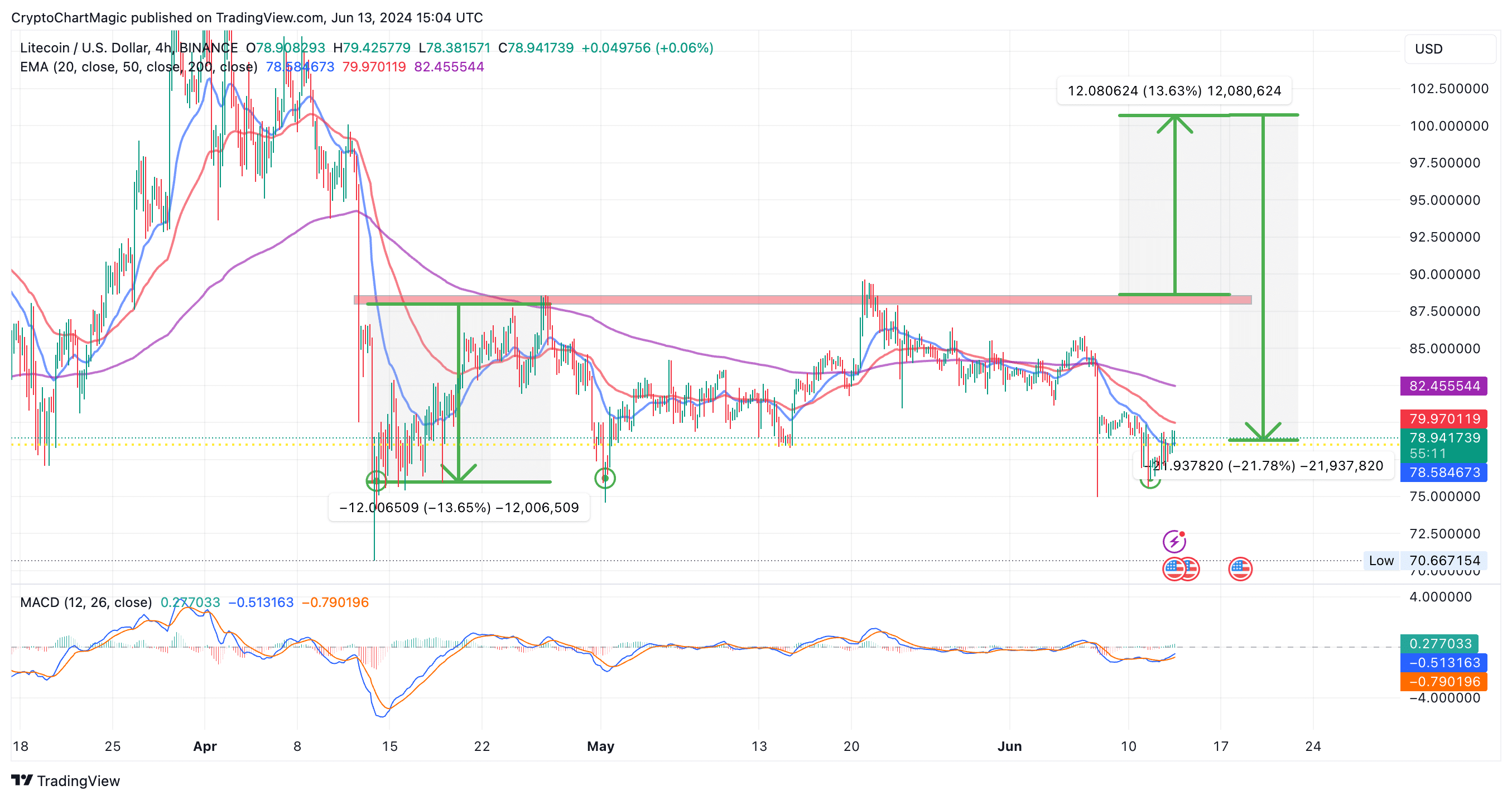 LTC/USD 交易对也显示出了很大的突破潜力。此前,该交易对在 75 美元处建立了稳固的支撑位,并由三重底形态支撑。