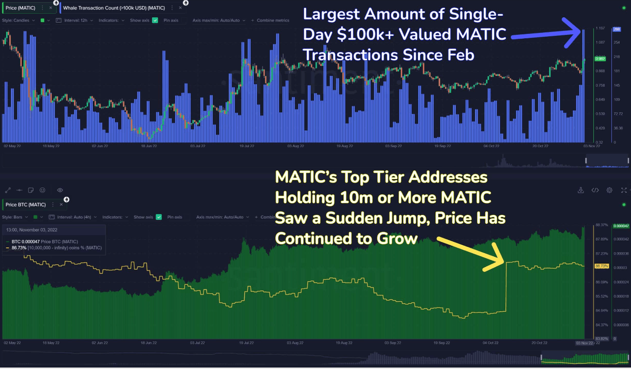 截至发稿时,MATIC 的交易价格为 1.14 美元,市值为 94 亿美元。MATIC 的**价格上涨是由于鲸鱼交易达到八个月高位的结果。昨天,11 月 3 日,见证了超过 10 万美元的单日交易量**。链上数据提供商Santiment报道: