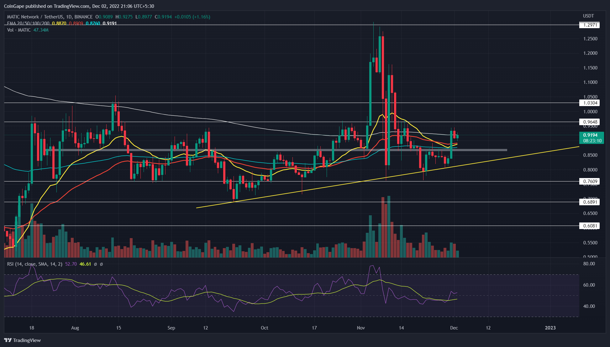此外,11 月 29 日该支撑的**一次逆转补充了看涨势头,帮助买家突破了 0.87 美元的关口。MATIC 价格从上述阻力位大幅突破,成交量强劲,表明买家有信心走高。
