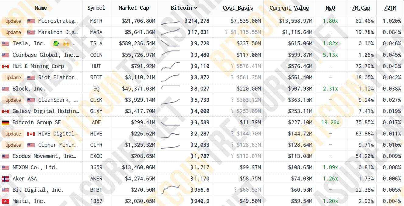 持有比特币的**上市公司的统计数据。来源:比特币宝藏