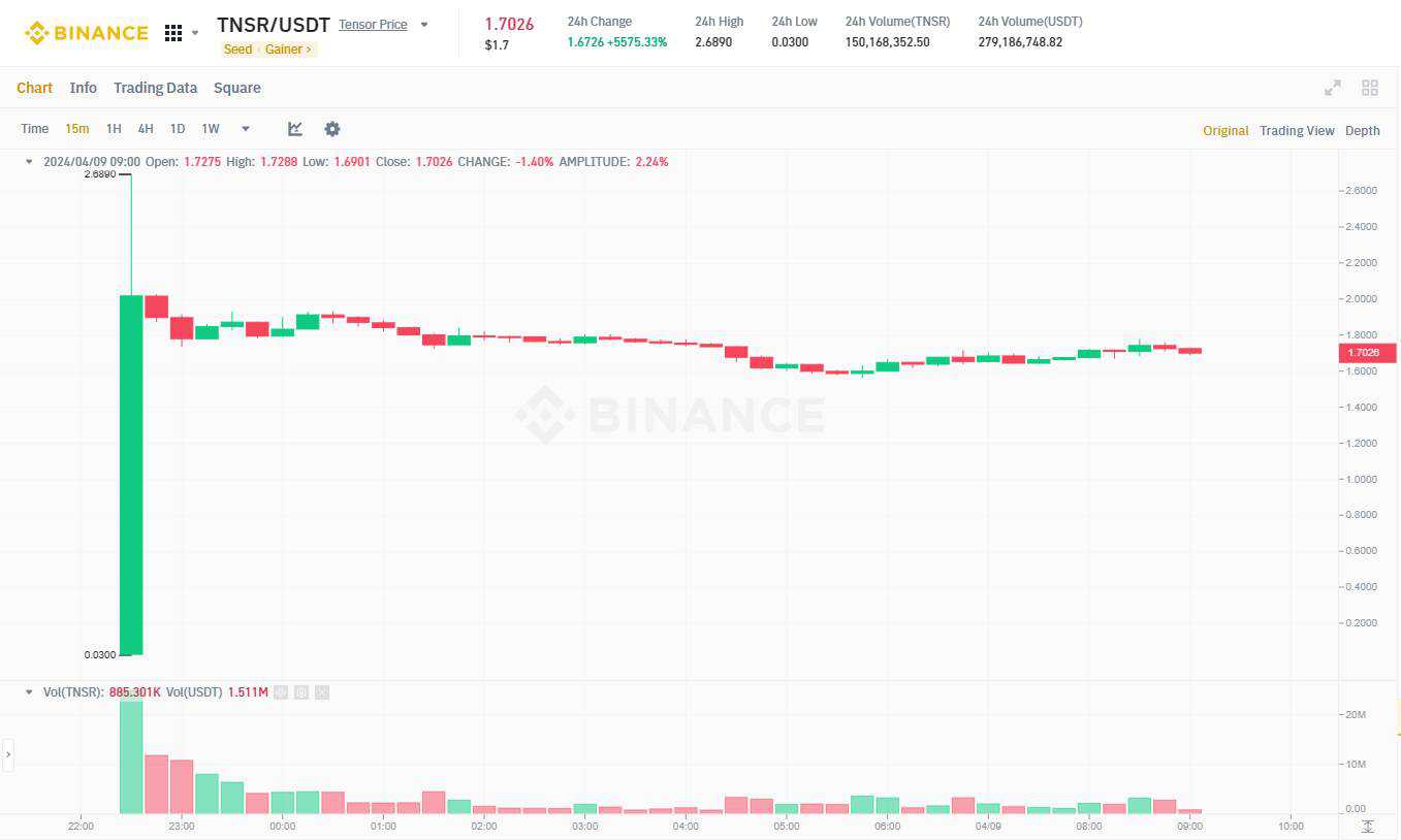 币安 2024 年 4 月 9 日上午 09:15 TNSR/USDT 货币对 1500 万图表
