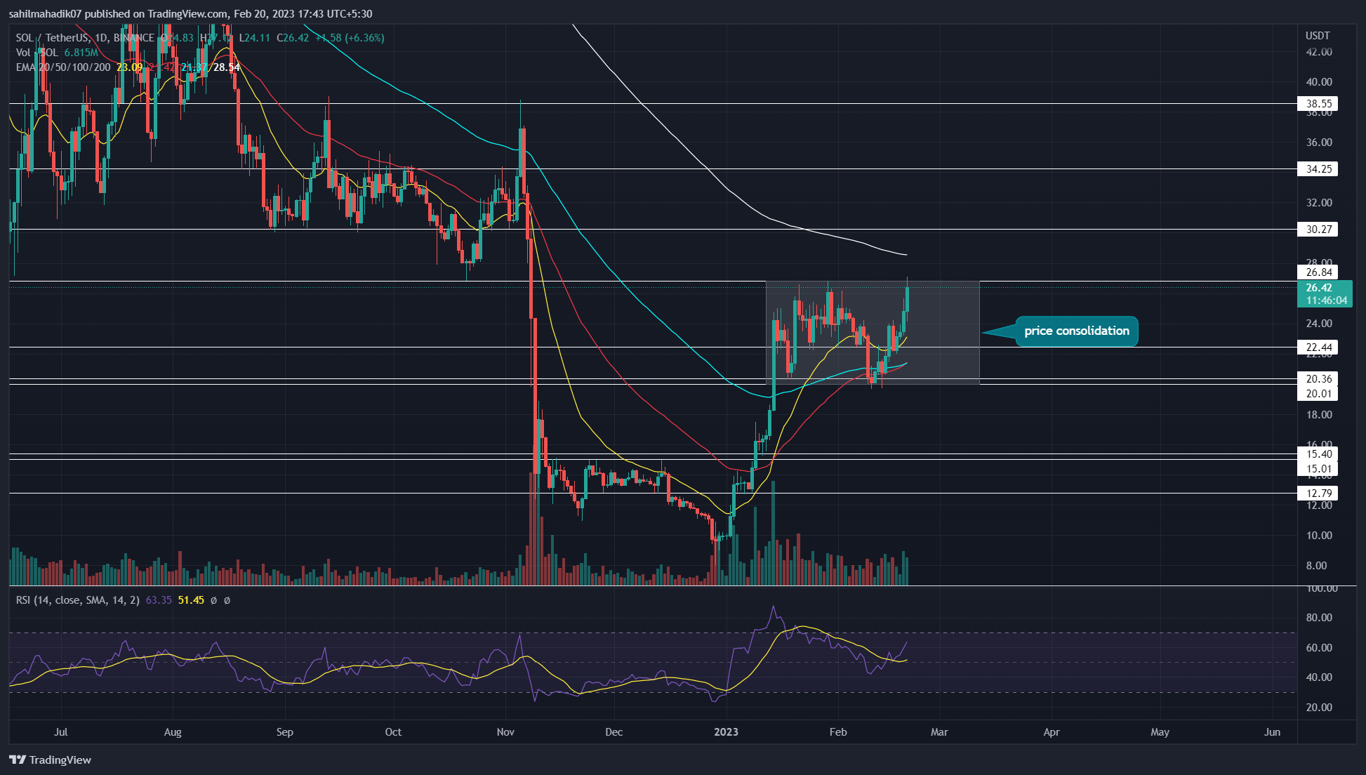 在 1 月份的**性反弹之后,Solana **价格在触及 26.84 美元的阻力位后横盘整理。这一巩固阶段旨在补充看涨势头并检查新收复水平的价格稳定性。以下是感兴趣的投资者如何从这种区间反弹中获益。