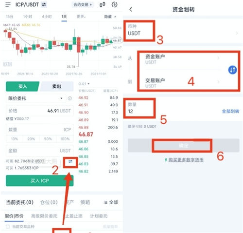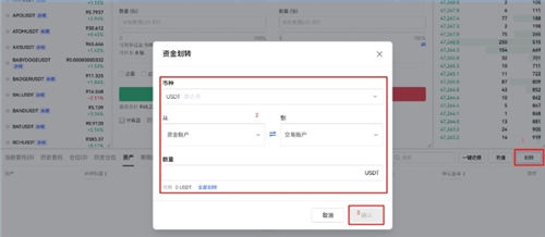 2.进行资金划转。将币种从【资金账户】划转到【交易账户】,填写【数量】,点击【确认】。