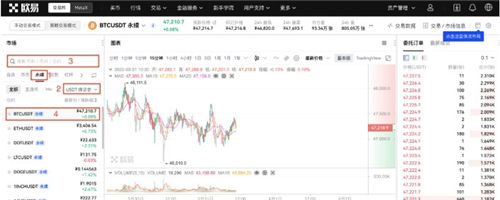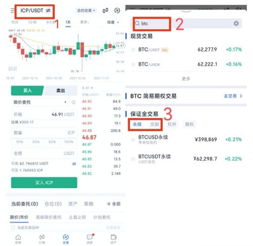 3.选择合约类型,再选择或者搜索您想要交易的币种、币对。