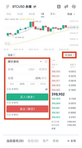 4.在开仓选项下,选择全仓或逐仓。填写委托信息,进行【买入开多】或者【卖出开空】的交易操作。