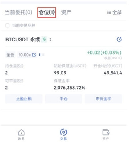 开仓后可在【仓位】栏下,查看订单信息,可设置止盈止损或进行平仓操作。