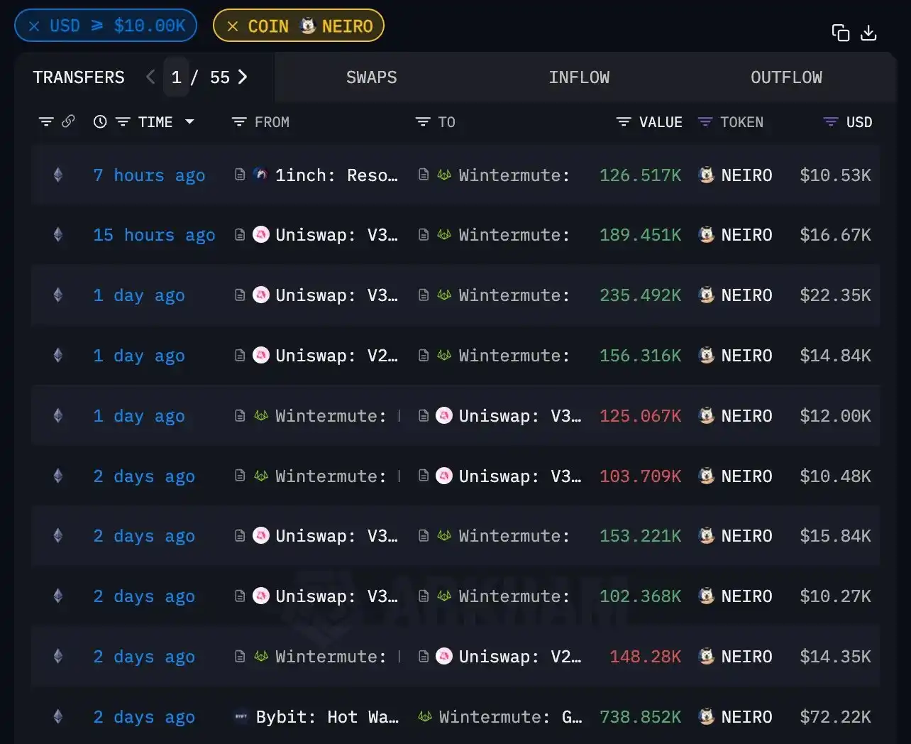 Wintermute 参与大写 $NEIRO 做市:曾持有总供应量 4.35% 的**且一度为**大持有者,收到**后积极与各大交易所和 DEX 保持**交易。