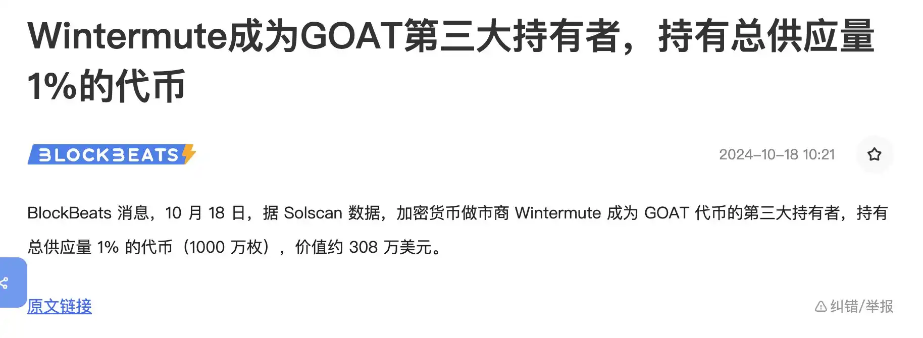 早上看到快讯「Wintermute 成为 $GOAT 第三大持有者,持有总供应量 1% 的**」,但正如向 V 神空投**是宣传手段一样,向做市商空投**也不是新鲜事了。