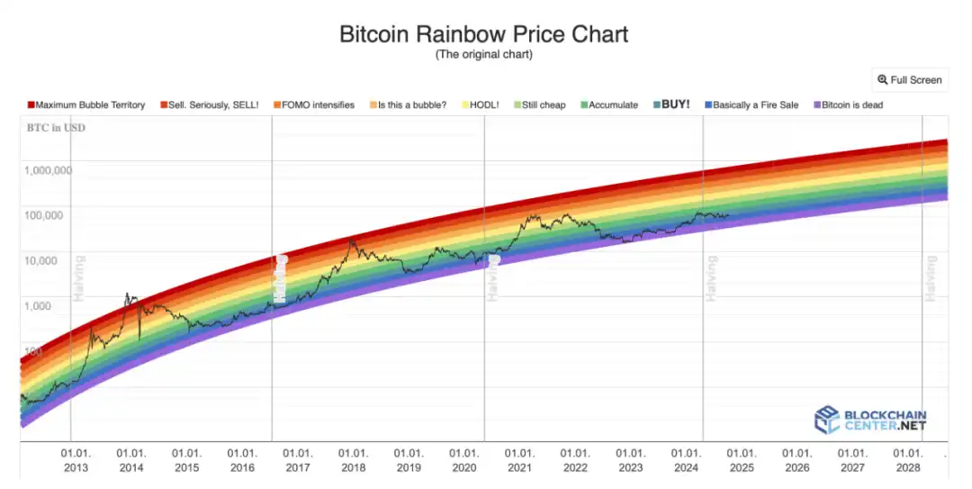 BlockchainCenter 的比特币彩虹价格图