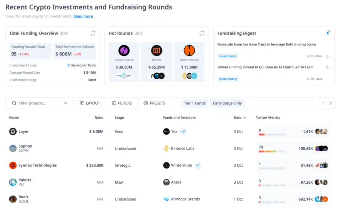 · Crypto Fundraising 是一个有价值的资源,追踪**的募资轮次、事件和新闻。它提供尚未被其他分析平台覆盖的专案资讯。该网站还提供简单方便的资金、投资者及其联络方式的列表。