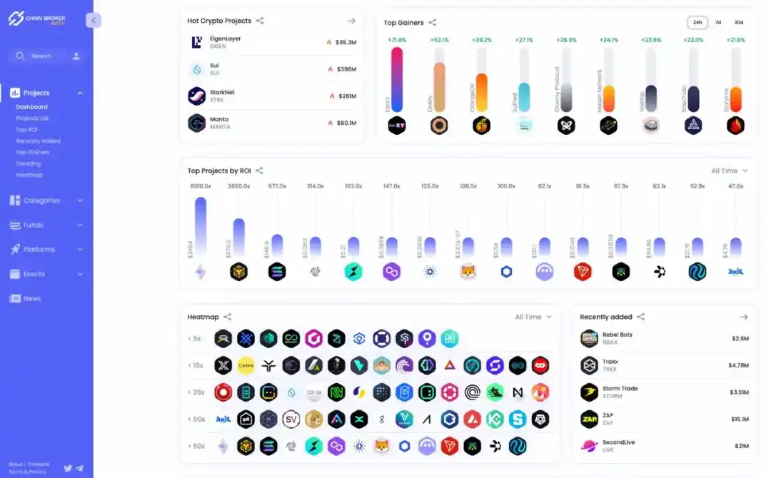 · ChainBroker 是一个设计用于追踪网路和**各种金融指标的服务。它使用户能够分析市场状况、投资者活动和平台参与情况。该网站还在某些类别中提供热点图,直观评估网路和资产随时间或特定时期的潜力。