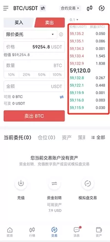 委托单查看:【买入/卖出】页面下方,可以查看【当前委托/仓位/资产】等信息。点击【**】按钮,可以查看您的【当前委托】(即当前没有成交的挂单)、【历史委托】(即已经成交和已撤销没成交的委托单),委托单里可以详细看到您的委托时间,币对和成交量等信息。