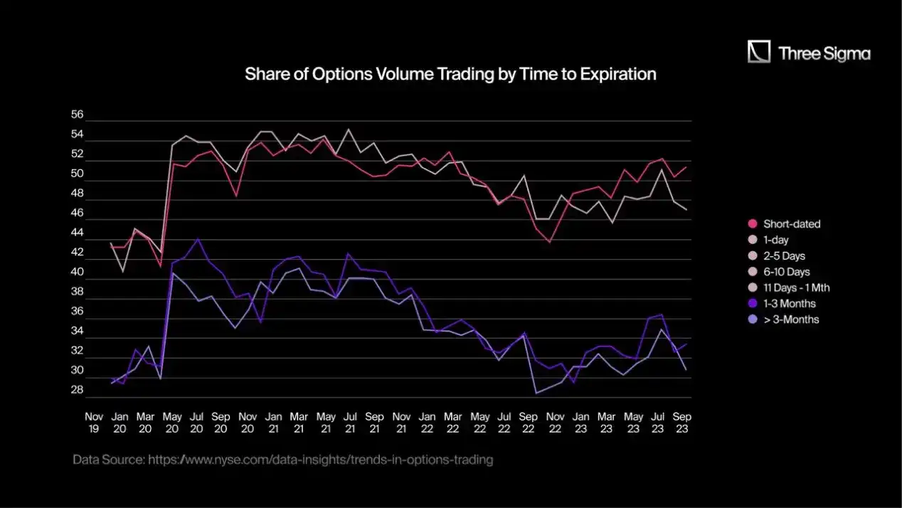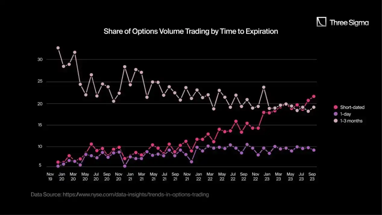 「[…] 根据我们的估计,美国股票市场期权交易量的零售份额为 […] 45%,[…]。零售期权份额的增长最初是由 2020 年的疫情推动,随着零售期权交易者抓住短期期权押注市场走向,这一份额持续增长。低价期权的交易量份额也在增加,进一步推动了整体期权交易量,尤其是散户交易量。这些趋势似乎都没有逆转的危险。」纽约证券交易所