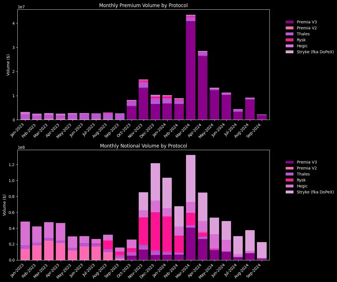 然而,到 2024 年,情况开始发生变化。新的交易所和产品的引入,如 AEVO、Derive(Lyra 的应用链)和 Stryke 等,帮助重新激起了人们对该领域的兴趣,逐渐夺回了市场份额。以下为名义交易量数据: