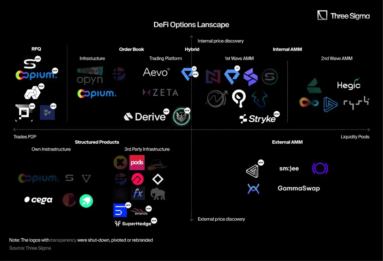 使用内部 AMM 为期权定价的协议。一些协议采用了复杂的流动性提供策略,而另一些则更简单,更多地依赖于其 LP 的风险。如今,10 个协议中有 3 个已经转型或关闭。
