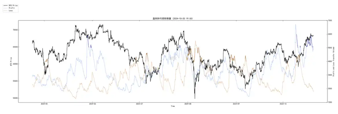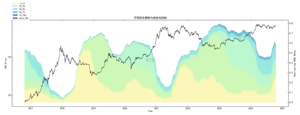 场内当前正处于短期参与者**增加持仓,⻓期参与者略微售出筹码的节奏中。可能市场当前的不稳定在于⻓期参与者将筹码传递给短期参与者,短期参与者如果出现承接不住筹码的情况,可能市场会陷⼊停滞。