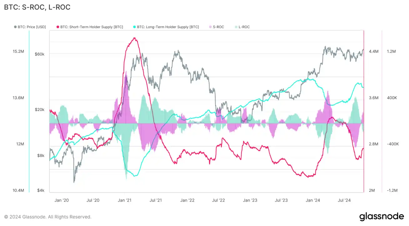 探索⻓期、短期持有者净头⼨变化,从时间维度上解析场内两股宏观趋势⼒量。