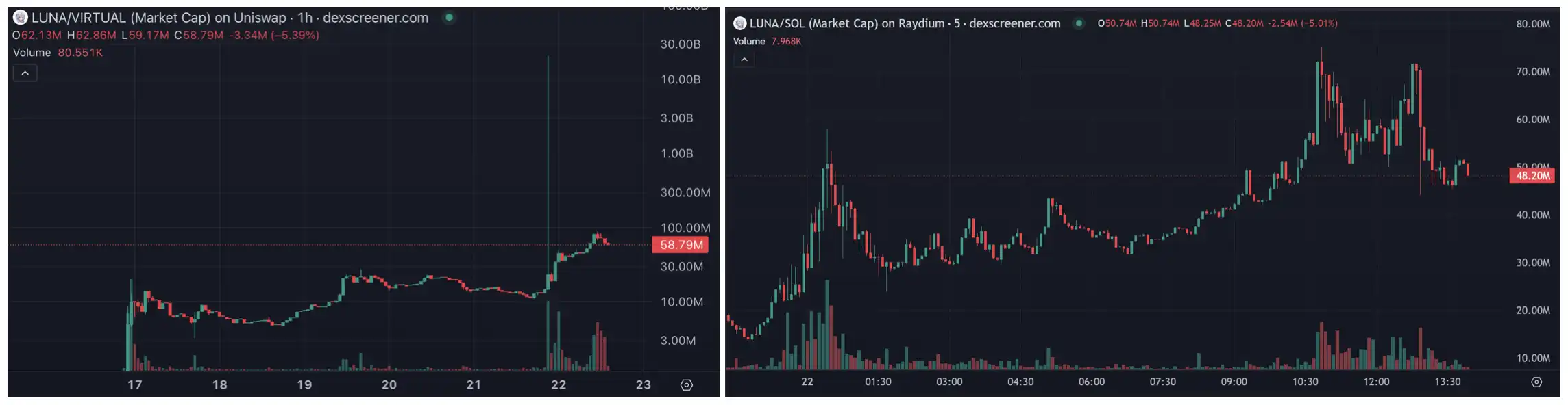 目前,Luna 在 Base 和 Solana 上均有交易池,市值**分别达到了 22.8B 和 75M,但 Base 链上是由于异常大额买单导致一根大阳线。