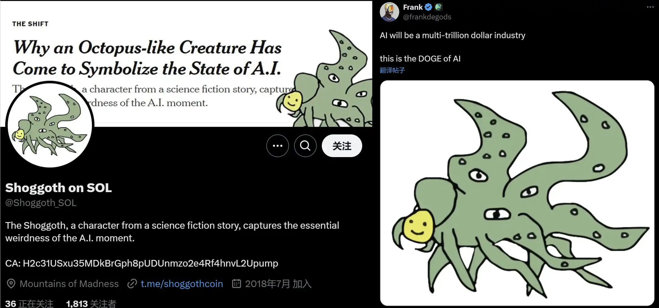 Shoggoth 在社区中被推崇为 AI meme 中的 Doge。这款风格独特的章鱼 meme 也曾被《纽约时报》「喊单」。纽约时报曾称 Shoggoth 是「人工智能中最重要的 meme」。