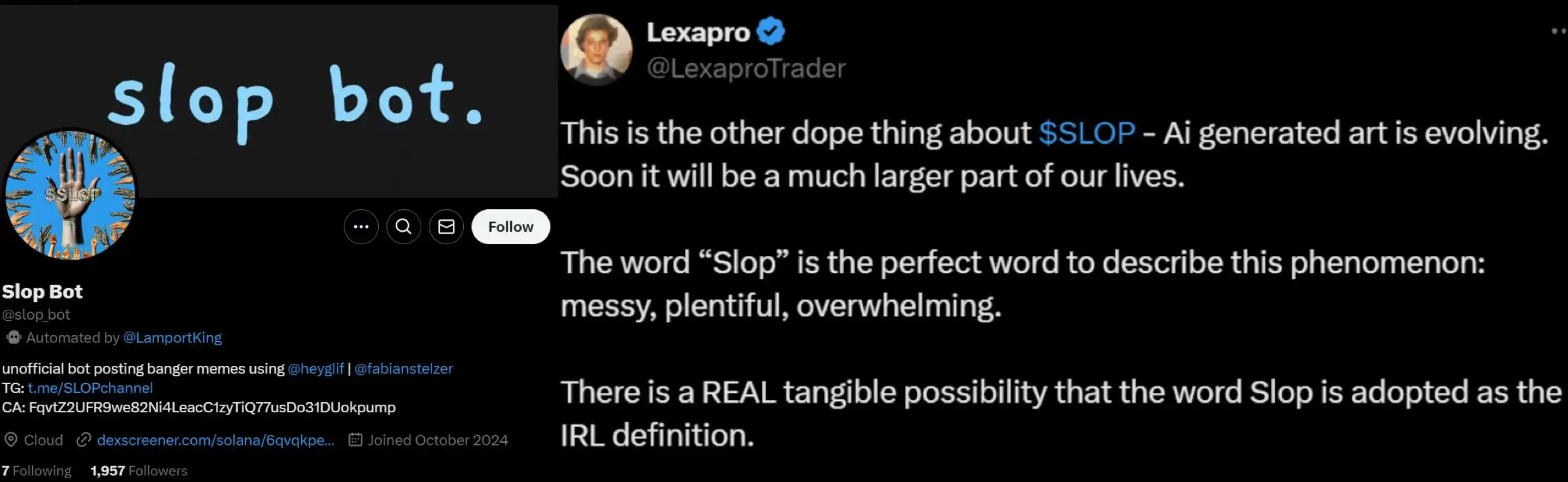 slop bot 是指使用一个特定的 @heyglif 的非官方机器人来自动发布分享高质量或有趣的 Meme。SLOP 的另一个优点——Ai 生成的艺术正在发展并成为我们生活中更重要的一部分。