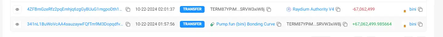 上线后,机器人迅速卖出,盈利 16 个 SOL。在 terminal of fun 卖出的 1 分钟内,该**直接暴跌 65%。10 分钟后,机器人故技重施,一摸一样的的套路买入另一个** bini,同样持仓 5 分钟卖出,盈利 13SOL。