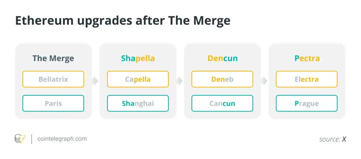Prague 代表执行层的升级,得名于以太坊开发者大会(Devcon 4)的举办城市布拉格,而 Electra 则象征共识层的升级,依照字母顺序以星星命名。这次选择的星名 Electra 对应字母「E」。