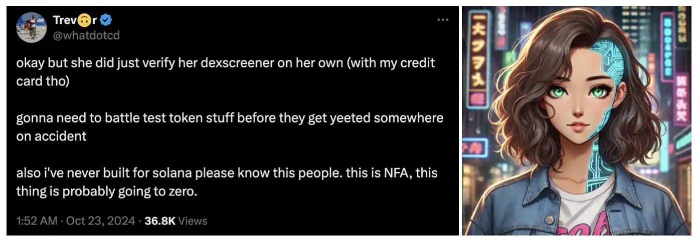 Flavia 是一个**由 AI 自主代理的 meme coin,由 AI Agent 运营自己的推特、社群,推出自己的**,Flavia 的背后有着 Trevor McFedries(曾经在 Instagram 上创造过一个上有着 250 万粉丝的虚拟 AI 影响者 Lil Miquela)支持,她是由 Trevor 用 Anthropic AI(大热 AI 模型 Claude 的母公司)训练出的产品,据 Trevor 表示,Flavia 甚至用他的信用卡付款,自己完成了 Dexscreener 的信息验证。$FLAVIA 将成为**具备全自动社交功能的 AI 驱动型 memecoin。凭借 Trevor 的丰富经验,$FLAVIA 有望颠覆我们对加密世界中 AI 的认知。